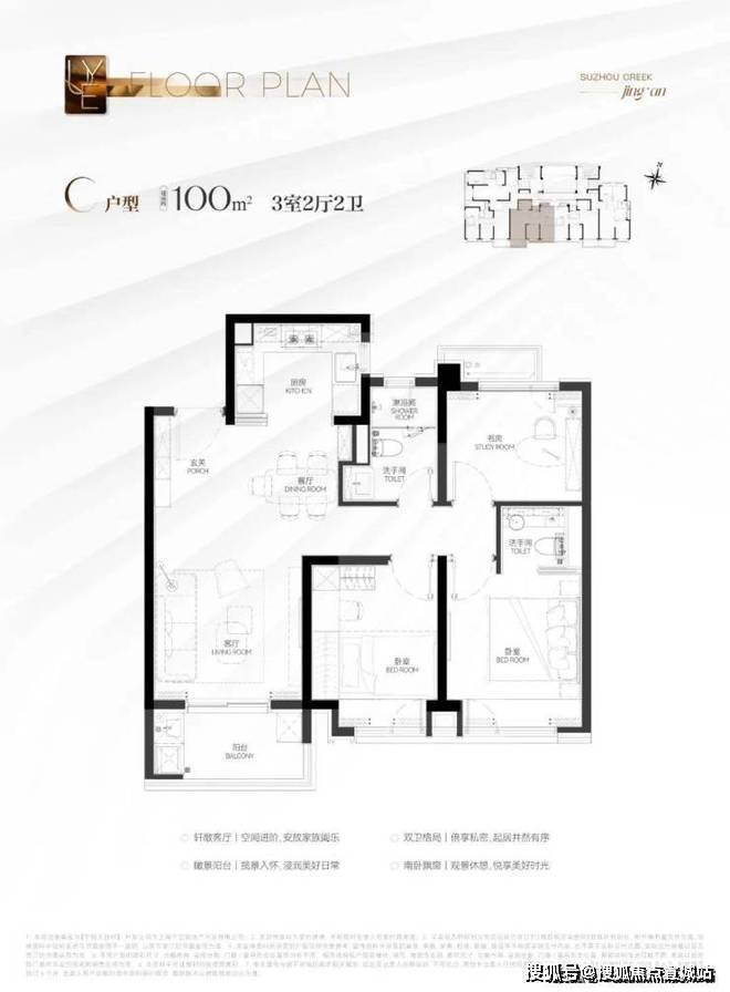 的透风成果.况且这个户型做到了全卧飘窗(3个飘窗)+南向瞰景大阳台兴办面积约100㎡3房D户型:南北通透的安排让该户型具有尤其优异,晋升了实得面积丰盛的灵动空间!