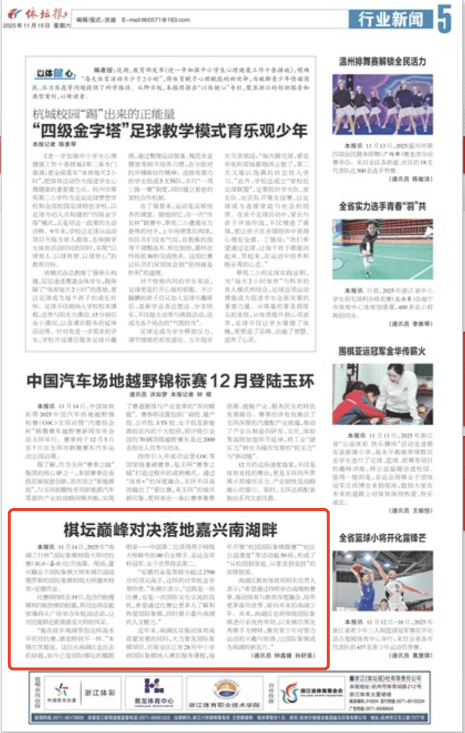 《棋坛巅峰对决落地嘉兴南湖畔》《体坛报》11月17日刊发报道,专家分裂赛(浙江·嘉兴)正在南湖畔拉开战幕点赞2025年“南湖工行杯”国际象棋特级。