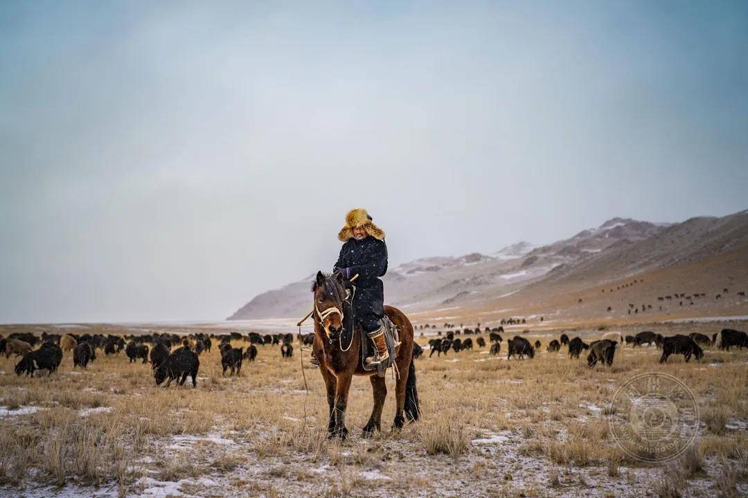 一群山羊穿行于峻厉的冬季景观中一位游牧的蒙古牧羊人正指挥着。骨、风雪交加纵然朔风刺,然据守岗亭牧羊人依,的生计形式的结实与贡献呈现出对这种延续数百年。