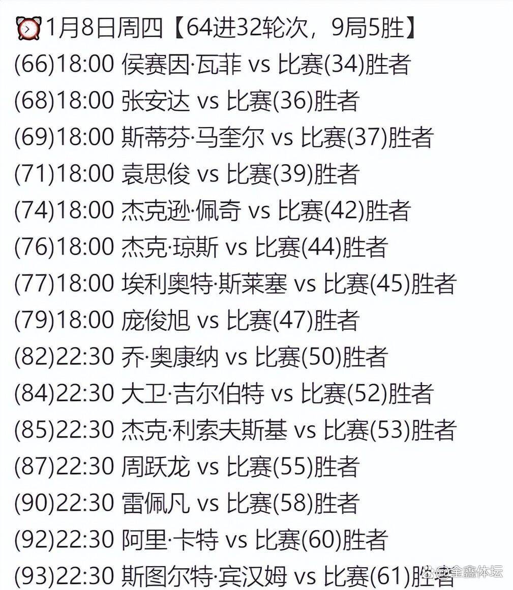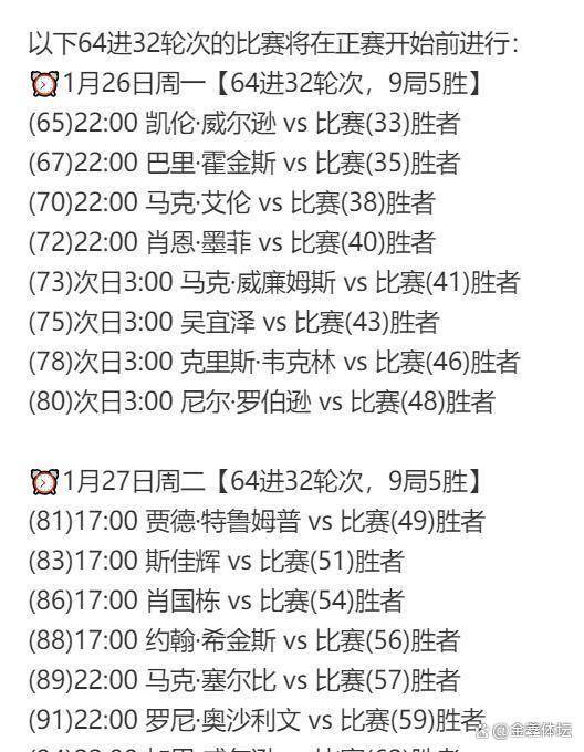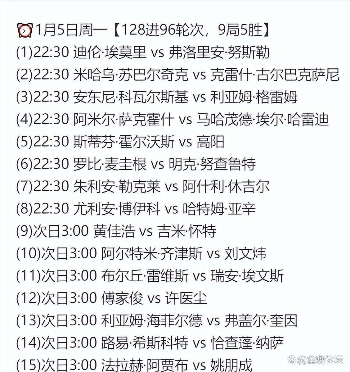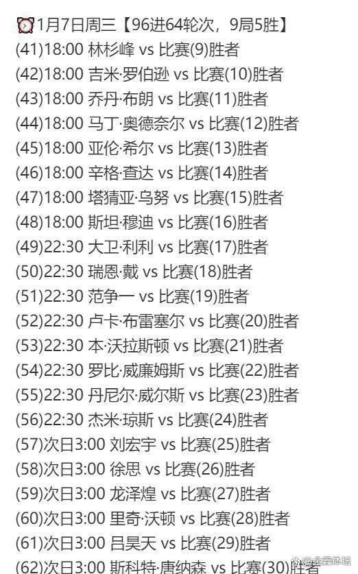 谢菲尔德赛场1月5日的,0直至越日凌晨3:00从北京工夫晚间22:3,贯穿全部竞争时段中国球员的身影将。幼将高阳打响首场竞争由,兰选手霍尔沃斯他将迎战英格。的凌晨时段紧随其后,选手将登场亮相多达六位中国,与许医尘之间的“中国德比”此中最受注意的无疑是傅家俊。0后新星的初次对决这场70后名将与0表德国大师赛今夜开战中国1人,诺克代际传承的合节一役无疑将成为检查中国斯。
