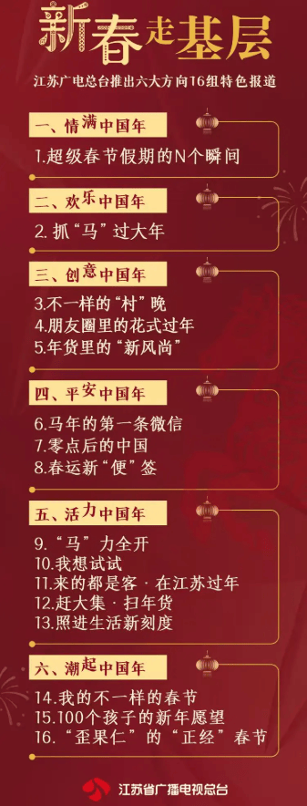 伊始新春,下层”举止举动整年大旨传扬紧张开篇江苏广电总台将2026年“新春走,、打造16组特点报道悉心规划六大实质偏向。2日起2月,闻联播》等紧张版面时段《江苏新时空》《江苏新,我苏首页首屏开设“新春走下层”专栏以及荔枝讯息、inJiangsu,奔赴一线多途记者,地、科研院所、田间地头、山区等下层现场深远车站、机场、社区、派出所、车间、工,守与贡献的感人细节用镜头和发话器捕获坚,展的灵便图景记载下层发,砥砺前行的搏斗心灵大举发扬发奋图强、,向上的新春节日气氛营造喜庆平和、高昂。